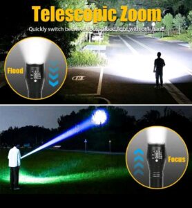 Built from durable aluminum alloy, the body is anti-slip, lightweight, and strong enough for everyday carry. The telescopic zoom function allows you to adjust the beam from wide flood to focused spotlight, depending on your need.