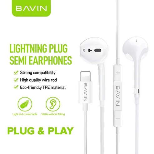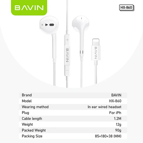 The BAVIN HX860 is a wired earphone built for iPhone users who want reliable sound with zero pairing and zero charging. Simply plug it into your iPhone Lightning port and start listening right away. With crisp stereo audio and an in-line microphone for calls, it’s ideal for daily commuting, studying, work, and gaming—while the included mini storage pouch helps keep it protected in your pocket or bag.
