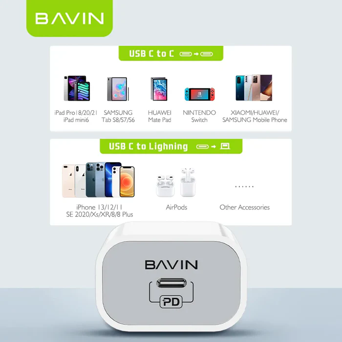 The Bavin PC851Y PD 20W Charger delivers fast and efficient charging for your devices with Power Delivery technology. Designed for convenience, it features a compact and lightweight body, making it perfect for travel or everyday use. Built with multiple safety protections, it ensures stable charging without risking damage to your devices.