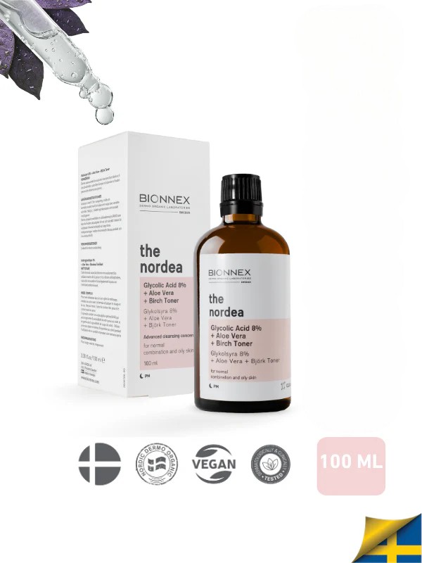 An exfoliating yet balanced toner combining 8% Glycolic Acid (AHA) with Aloe Vera and Birch to sweep away dull, dehydrated surface cells and reveal a smoother, brighter-looking complexion. While glycolic acid refines texture and helps fade the appearance of uneven tone, Aloe Vera comforts and hydrates, and Birch—drawn from Nordic botany—supports a fresh, refined feel. The fluid texture glides on evenly without stickiness and preps skin beautifully for serums and moisturizers. Especially suited to normal, combination, and oily skin, it’s a smart choice when you want visible glow and clarity without heavy residues.