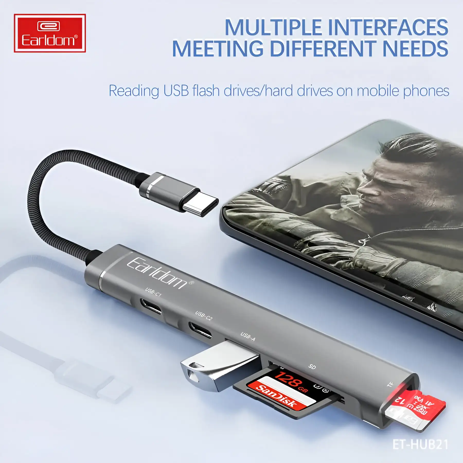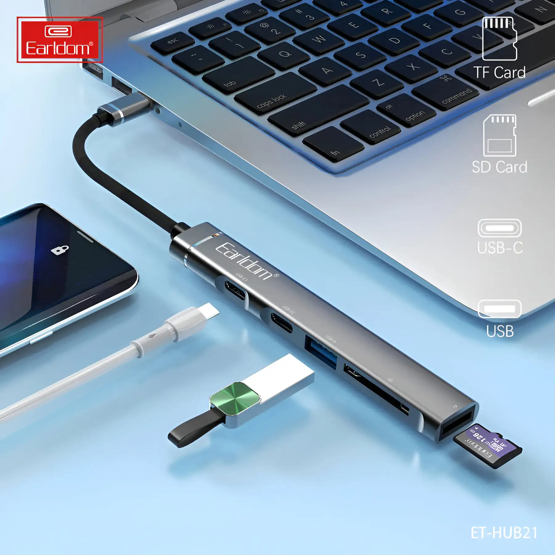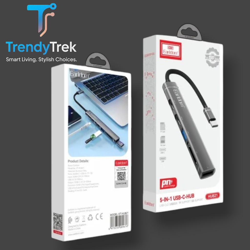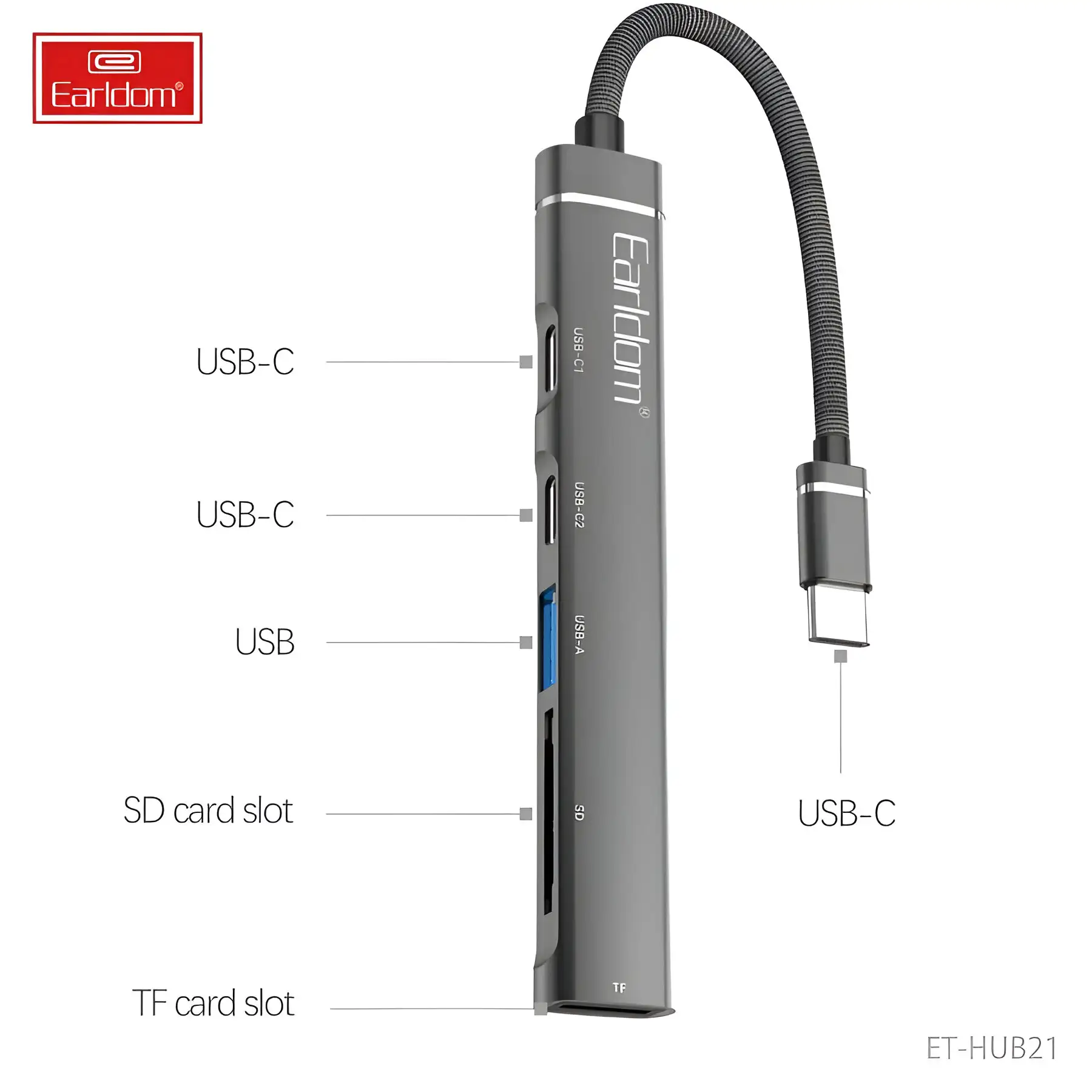 Upgrade your connectivity with the Earldom 5-in-1 USB-C Hub, designed to provide fast data transfer, efficient charging, and versatile compatibility in one sleek aluminum alloy body. This hub is the ideal companion for laptops, tablets, and smartphones, giving you all the ports you need without the clutter.