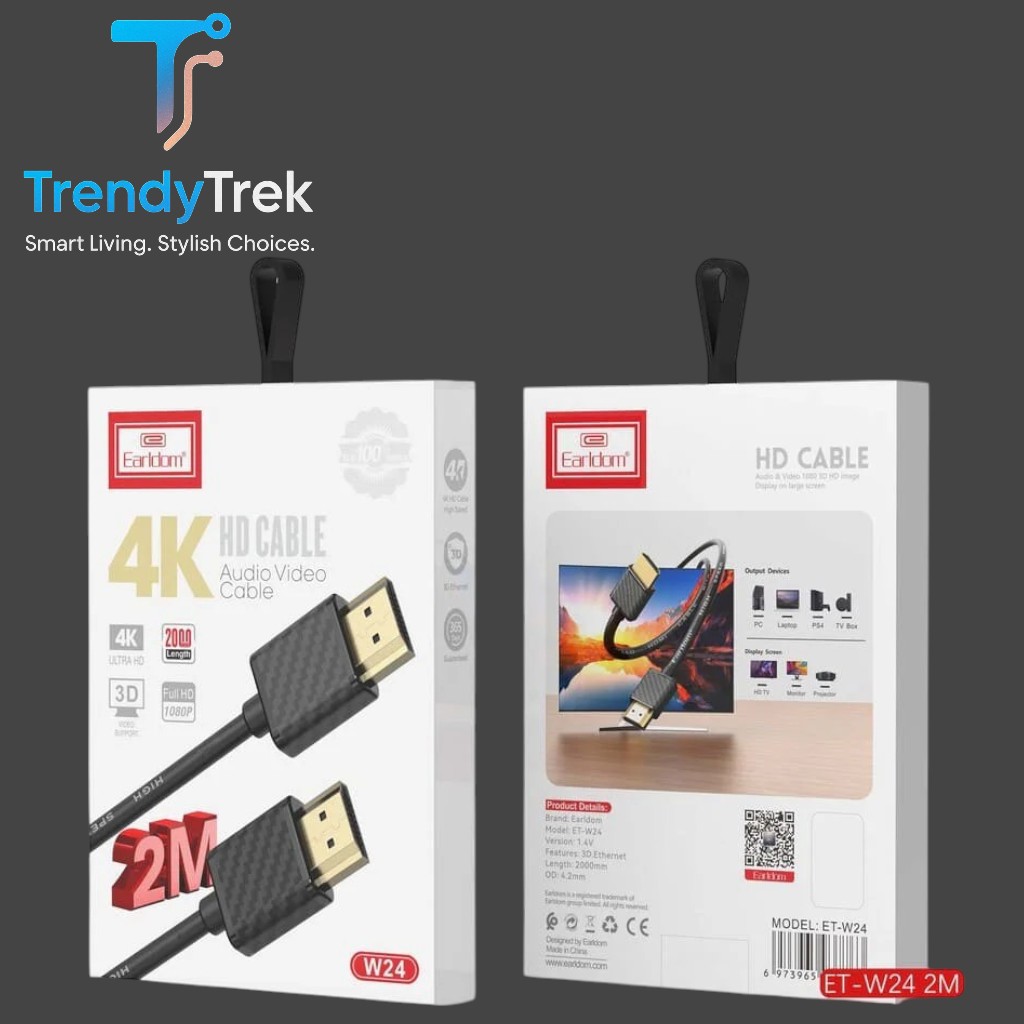 Experience crystal-clear visuals and immersive audio with the Earldom ET-W24 HDMI Cable. Designed for maximum performance, this high-quality cable supports 4K Ultra HD resolution and 3D video, delivering vibrant colors and smooth motion for your favorite content. The 2-meter length provides flexibility for various setups, while double shielding ensures minimal interference and stable signal transmission. With metal shielding and a durable build, it’s perfect for connecting TVs, monitors, projectors, gaming consoles, and more.