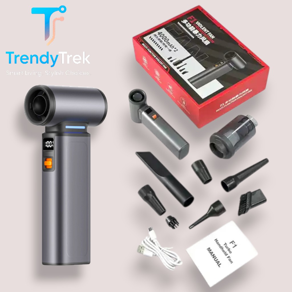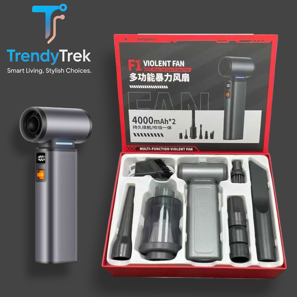 Clean smarter and faster with the F1 Multi-Function Violent Fan — a powerful handheld turbo blower that also converts into a compact suction cleaner. Designed for deep dust removal and precision airflow, it’s ideal for keyboards, electronics, car interiors, window tracks, and hard-to-reach corners. With dual high-capacity batteries and adjustable speed control, this all-in-one device delivers strong performance in a compact, easy-to-use form.