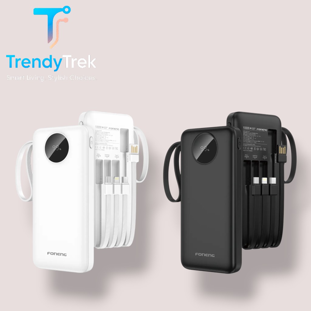 Stay powered during your busy days with the Foneng DX101 Power Bank (10,000 mAh). This sleek and portable device includes four built-in cables—USB-C, Micro USB, Lightning, and USB-A—so you’re always ready to charge multiple devices without having to carry extra cables.