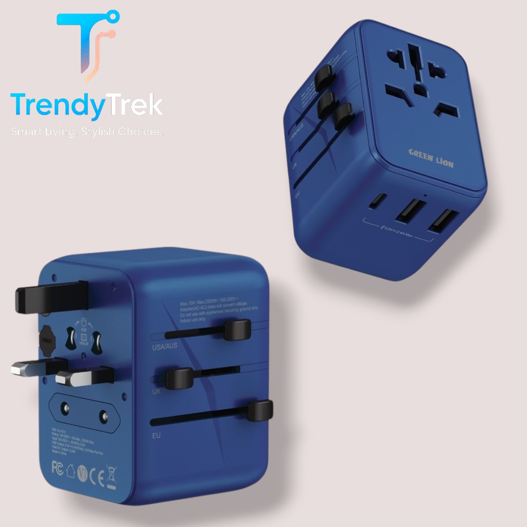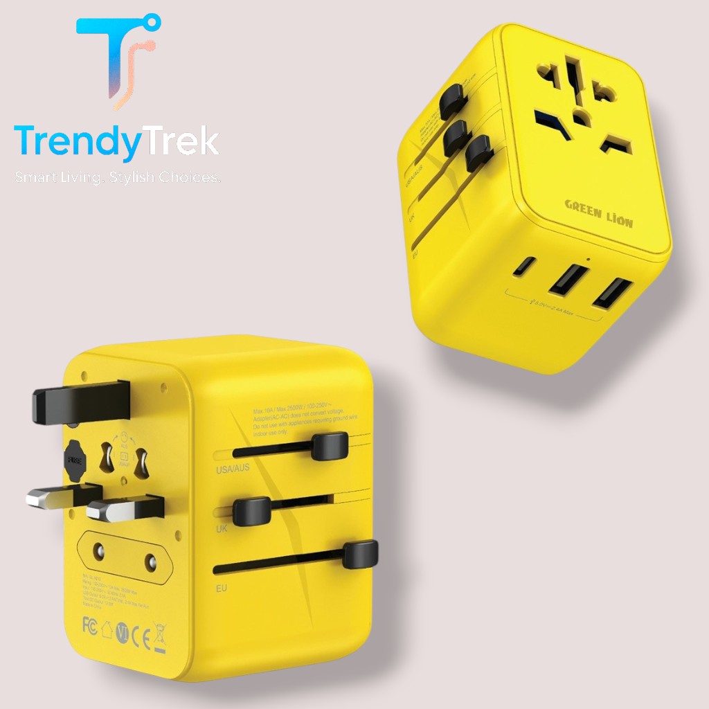 Available in Blue, Yellow, and White, the Green Lion Universal Travel Adapter combines functionality, style, and portability for every traveler’s charging needs.
