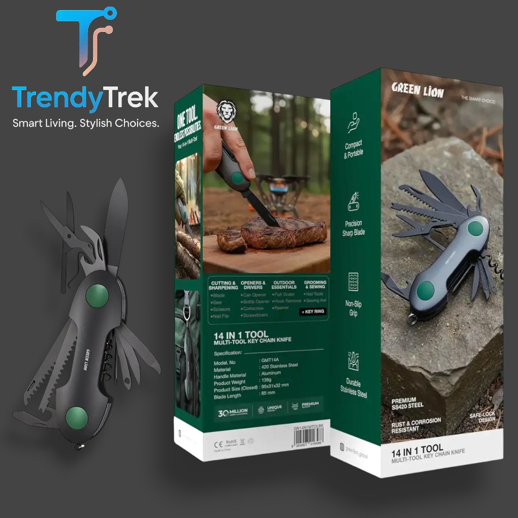 Compact, versatile, and built for everyday convenience, the Green Lion 14-In-1 Multi-Tool Keychain Knife is designed to keep essential tools always within reach. Whether for daily tasks, outdoor adventures, or travel, this portable multi-tool delivers practicality and reliability in a sleek, easy-to-carry design.