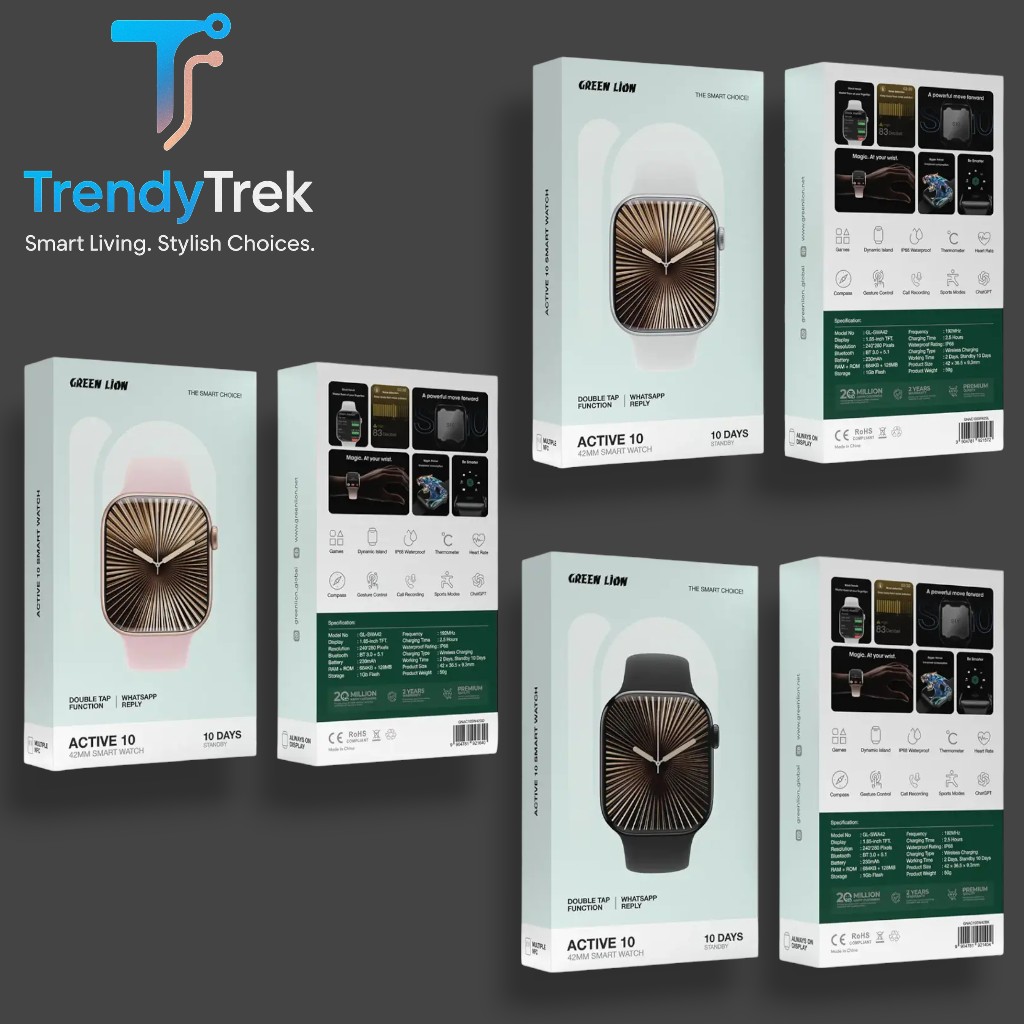 The Green Lion Active 10 42mm Smart Watch blends minimalist design with advanced smart technology, giving you a premium wearable that enhances both productivity and wellness. Its 1.85-inch TFT display with 240 × 280 resolution offers rich clarity, vibrant colors, and excellent outdoor visibility, making every interaction smooth and enjoyable.