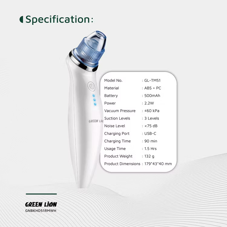 The Green Lion Blackhead Remover 5-in-1 Skin Care Solution is engineered to give you visibly clearer and healthier-looking skin from the comfort of your home. Designed with durable ABS + PC materials, this device combines professional suction technology, blue light therapy, facial massage benefits, and intuitive controls—all in one compact tool.