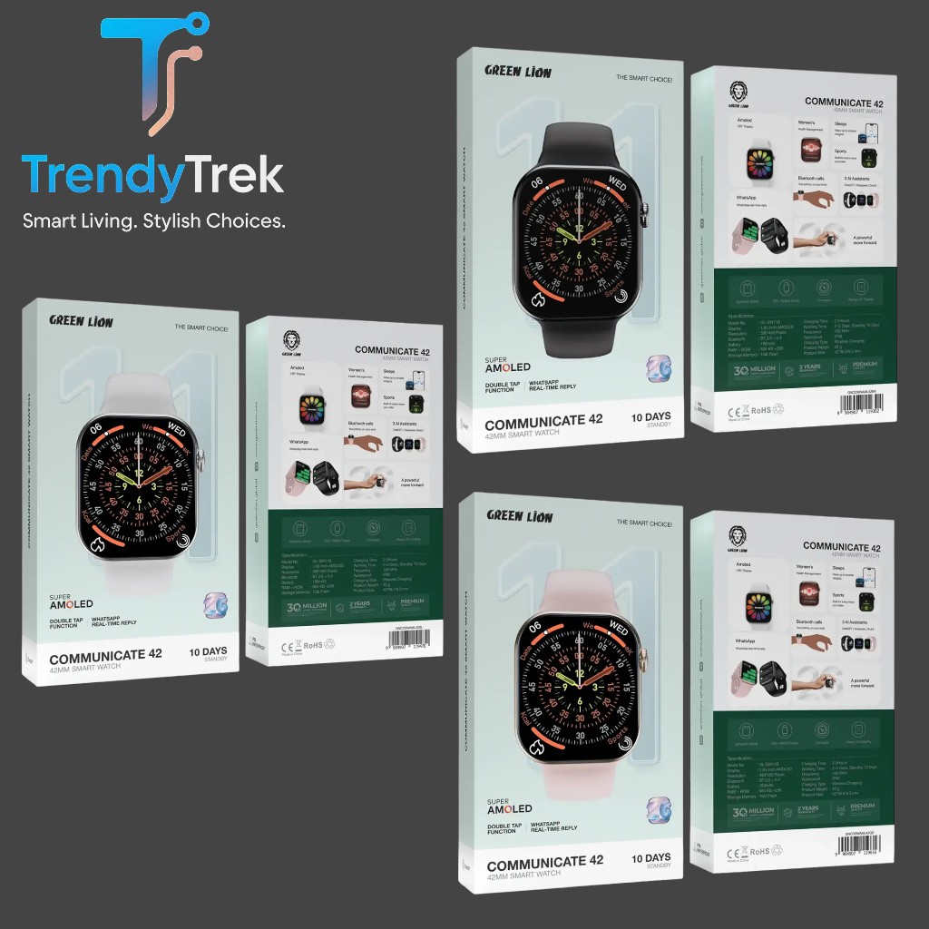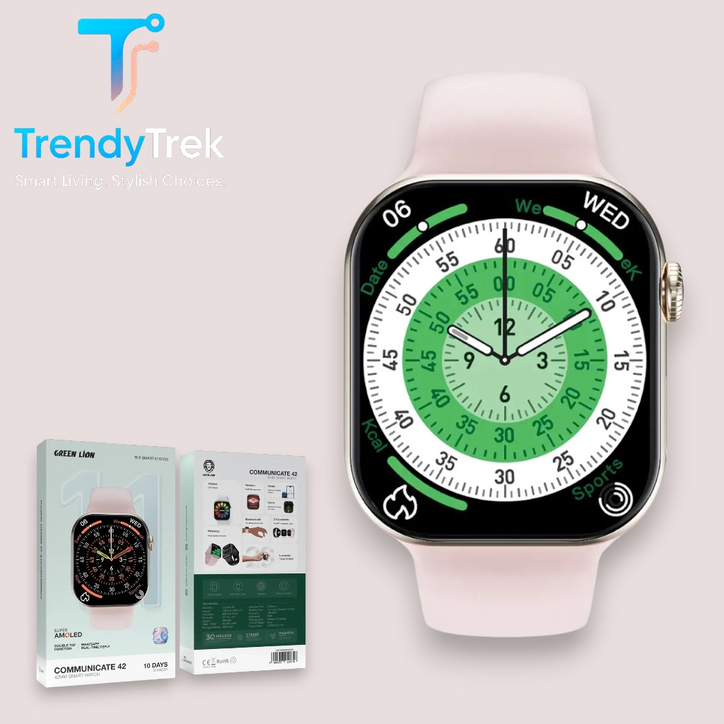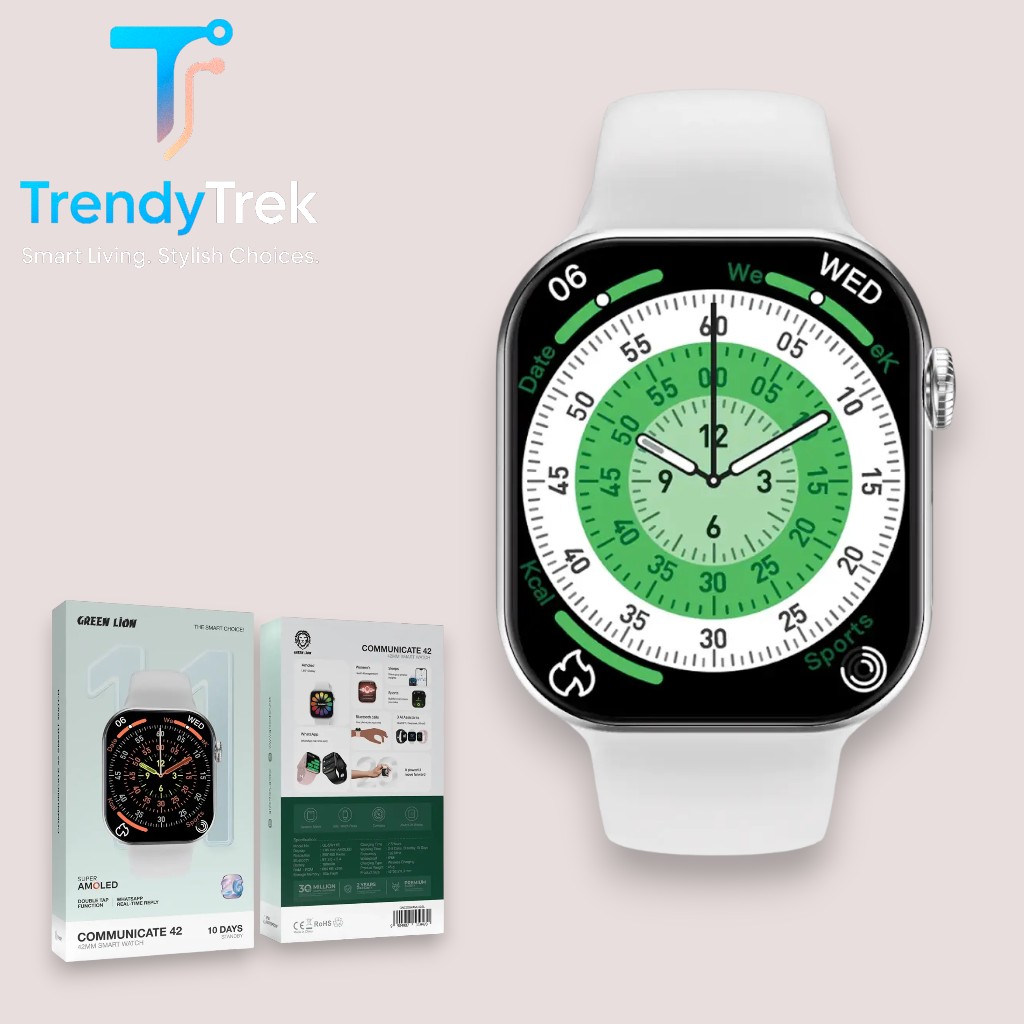 The Green Lion Communicate 42 Smart Watch – 42mm is designed for users who demand both aesthetics and intelligent functionality in one device. Featuring a large 1.85-inch AMOLED display with a 390×450 resolution, the screen delivers sharp visuals, rich colors, and excellent visibility for notifications, apps, and watch faces.