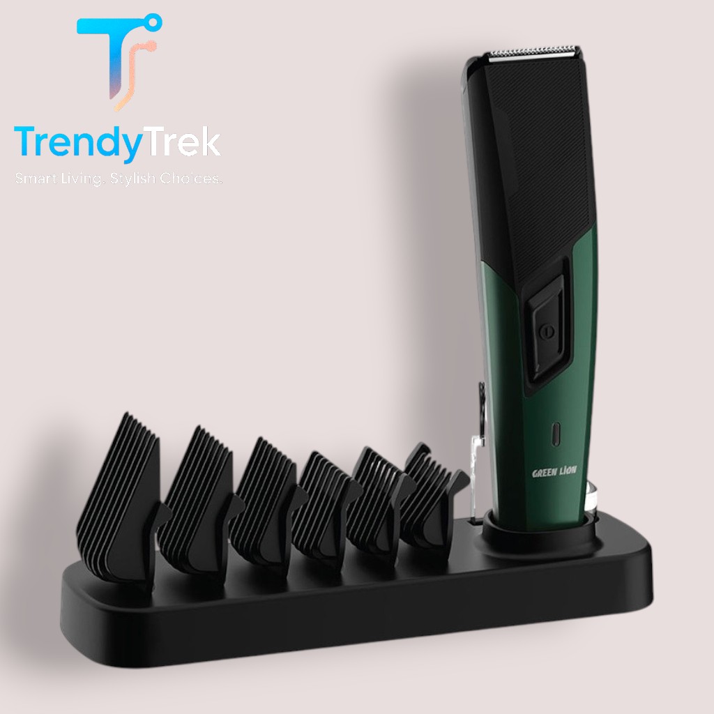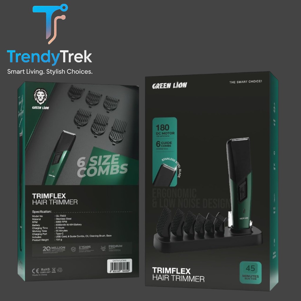 The Green Lion TrimFlex Hair Trimmer combines power, precision, and convenience in one sleek design. With its high-speed 6800 RPM motor, stainless steel blade, and six guide combs, you’ll achieve a clean and professional trimming experience every time. The ergonomic, low-noise body ensures comfort during use, while the LED power indicator keeps you informed of your battery status.