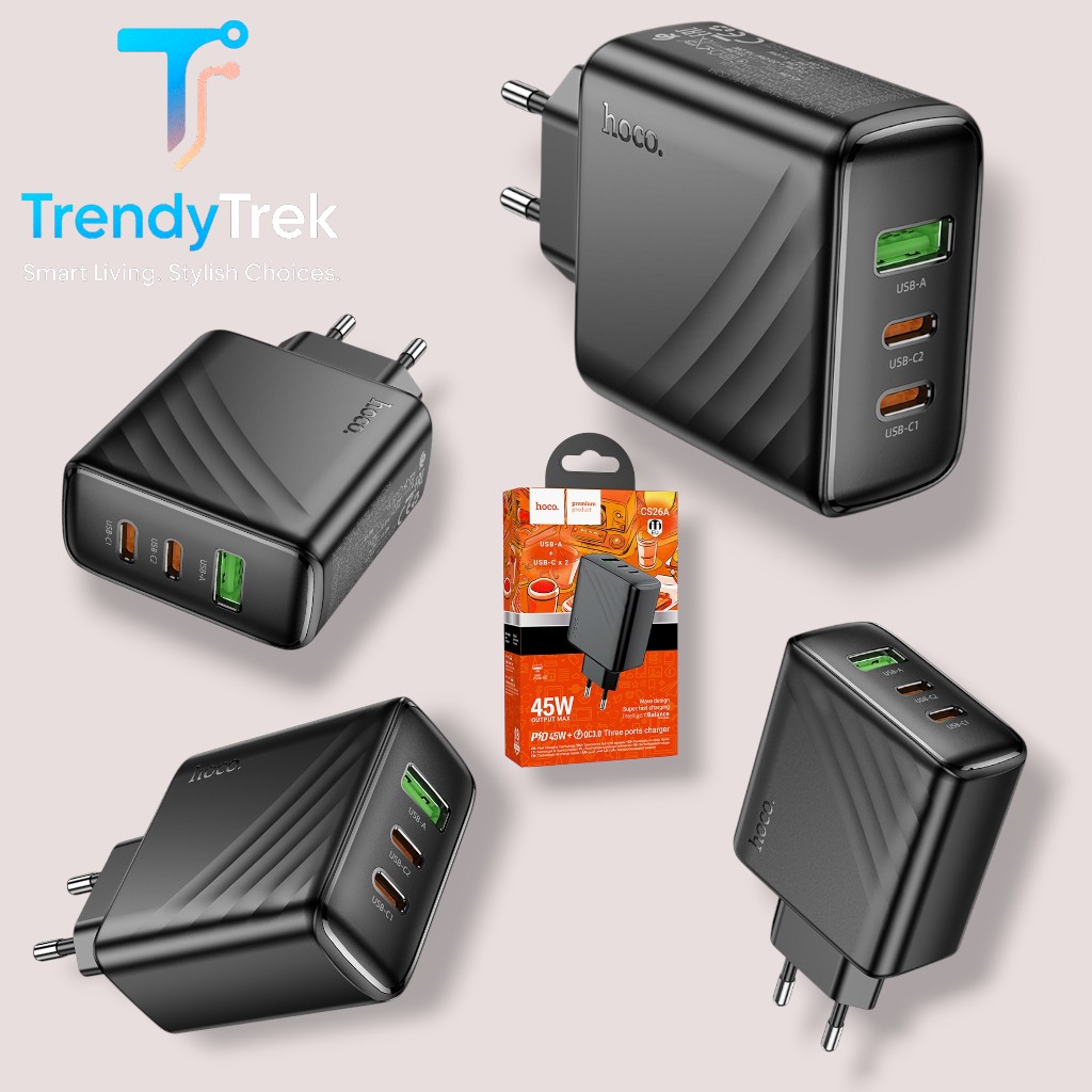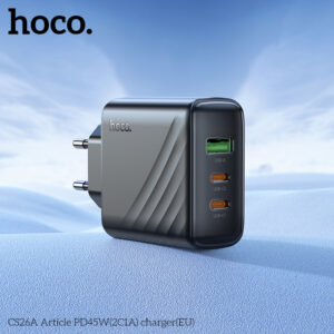 The Hoco CS26A is a premium 45W three-port wall charger designed to deliver powerful and efficient charging for all your devices. With two USB-C ports and one USB-A port, it supports PD 3.0, QC 3.0, PPS, FCP, and AFC fast charging protocols, making it compatible with 99% of digital devices including smartphones, tablets, wireless headphones, speakers, and power banks.