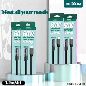 The Moxom 60W PD 90° Angle Game Data Cable Type-C to Type-C is designed for users who demand both performance and comfort, especially during gaming, streaming, or extended phone use. Featuring a 90-degree angled connector, this cable prevents obstruction while holding your device, allowing for a more natural grip without bending or blocking your hand during gameplay.