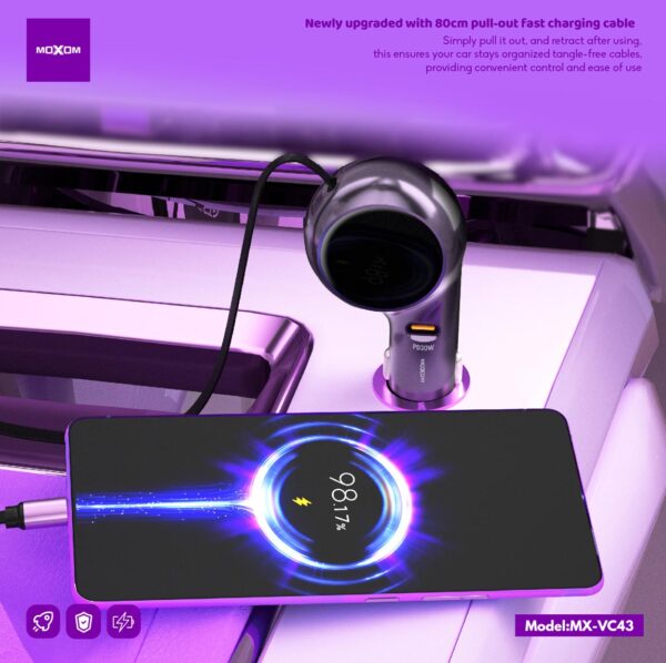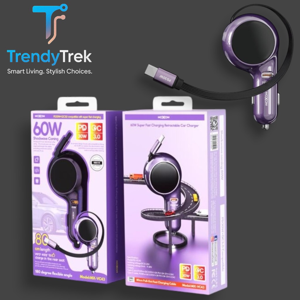 The MOXOM 60W Retractable Car Charger (Model MX-VC43) is your ideal in-car charging solution, designed for performance and ease of use. With dual support for PD30W and QC3.0, this charger ensures fast and stable charging for a wide range of devices.
