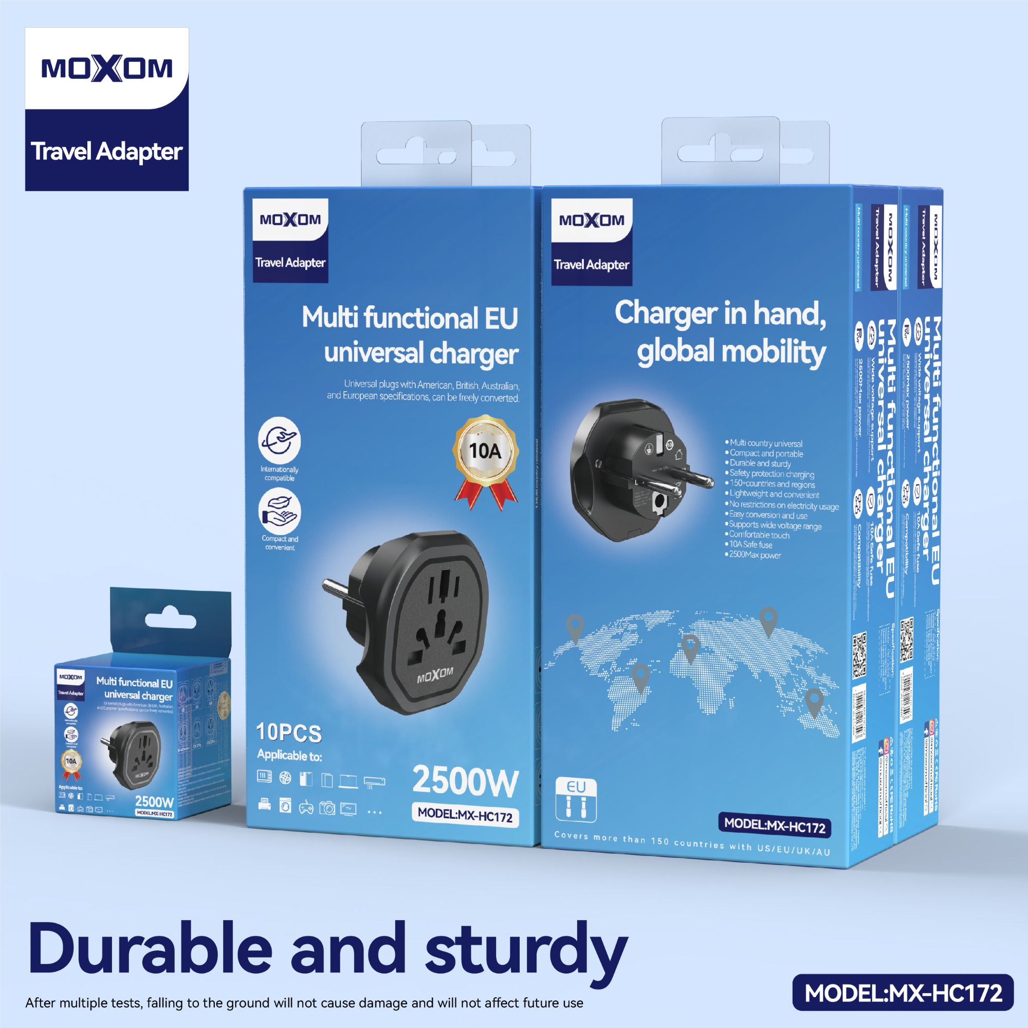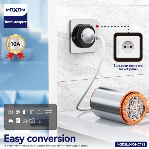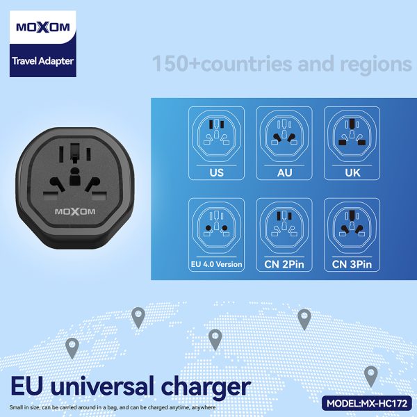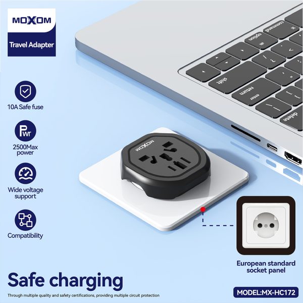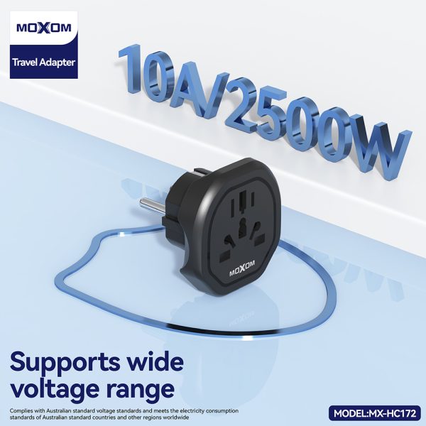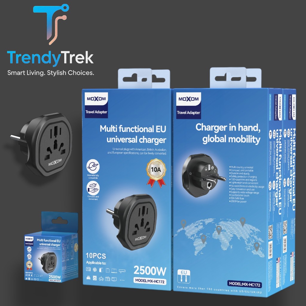 Stay powered anywhere in the world with the MOXOM Multi Functional EU Universal Charger, your ideal travel companion designed for maximum compatibility and safety. This compact adapter features support for US, UK, EU, AU, and CN plug types and provides a 2500W max output, making it perfect for high-demand devices.