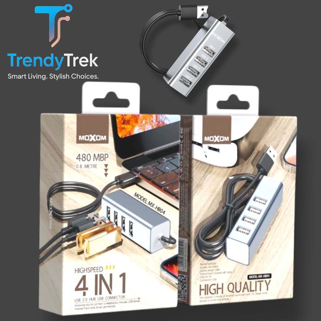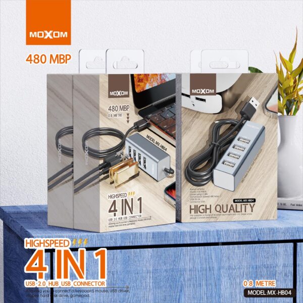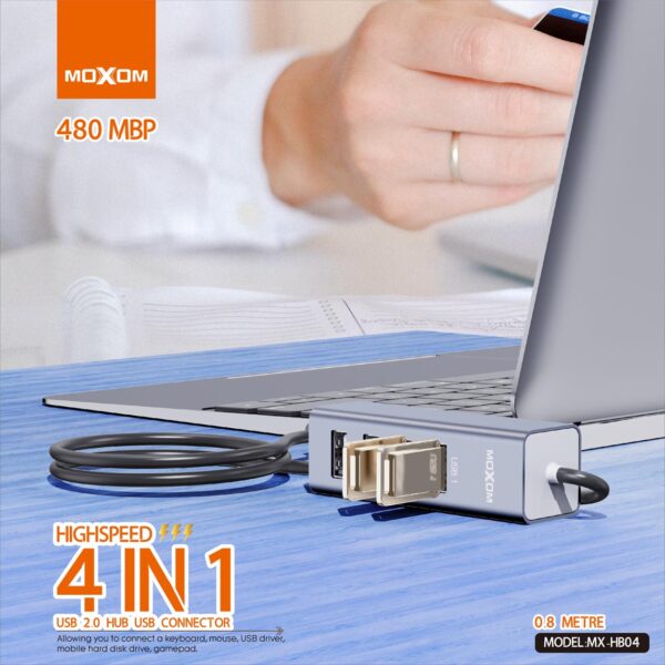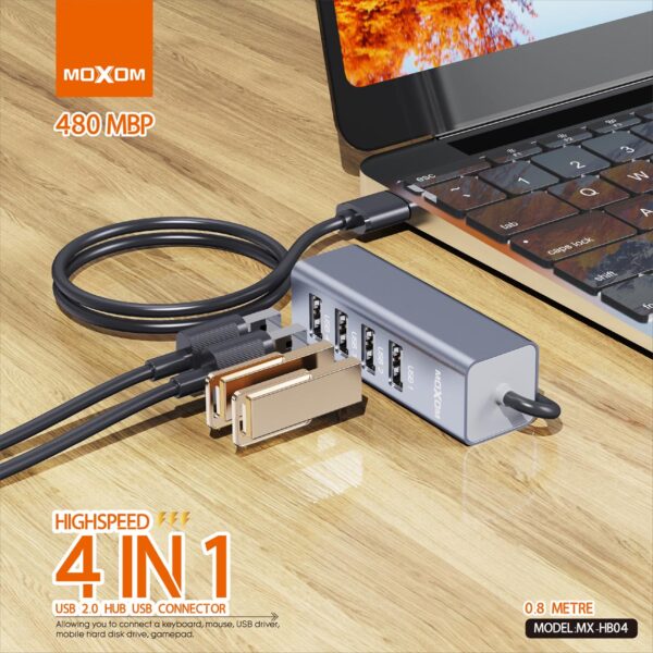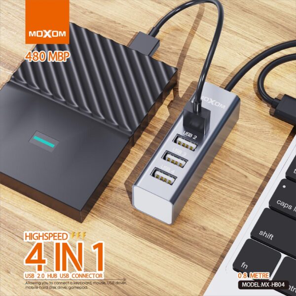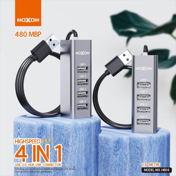 Expand your connectivity effortlessly with the MOXOM MX-HB04 4-in-1 USB 2.0 Hub, designed to let you connect up to four USB devices to a single port. Whether you’re using a laptop, desktop, or other USB-enabled device, this hub ensures seamless performance, portability, and practicality.