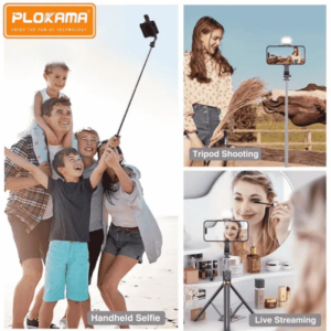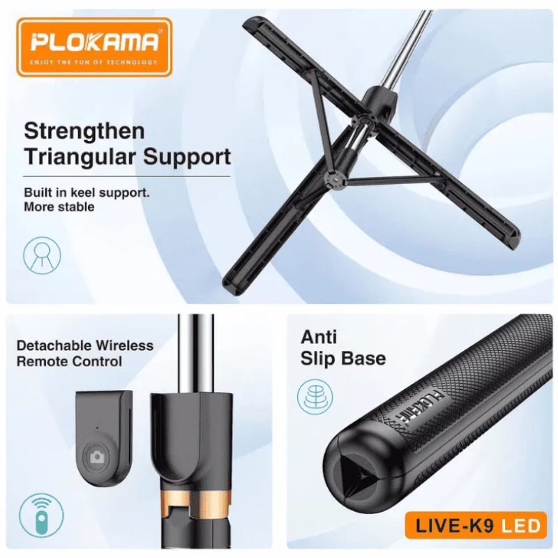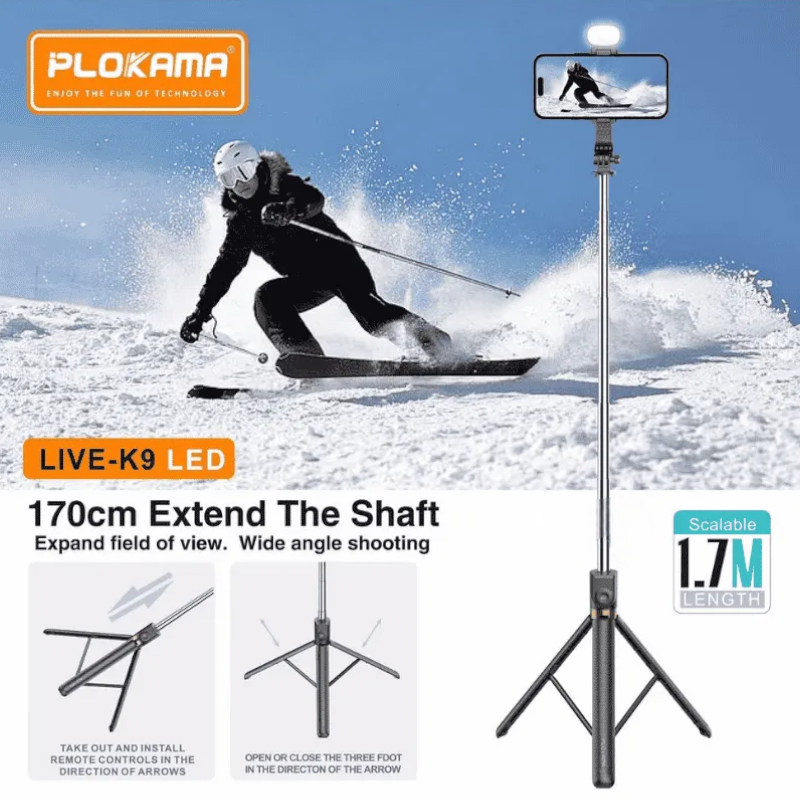 Whether you’re filming reels, going live, or just want a stable setup for calls, the Plokama LIVE-K9 LED is a practical all-in-one solution. It combines a stretchable 1.7m selfie stick, a built-in tripod base, and LED lighting to upgrade your content quality instantly. The included Bluetooth remote makes it easy to capture photos and start recording without touching your phone—perfect for creators, students, and everyday use.