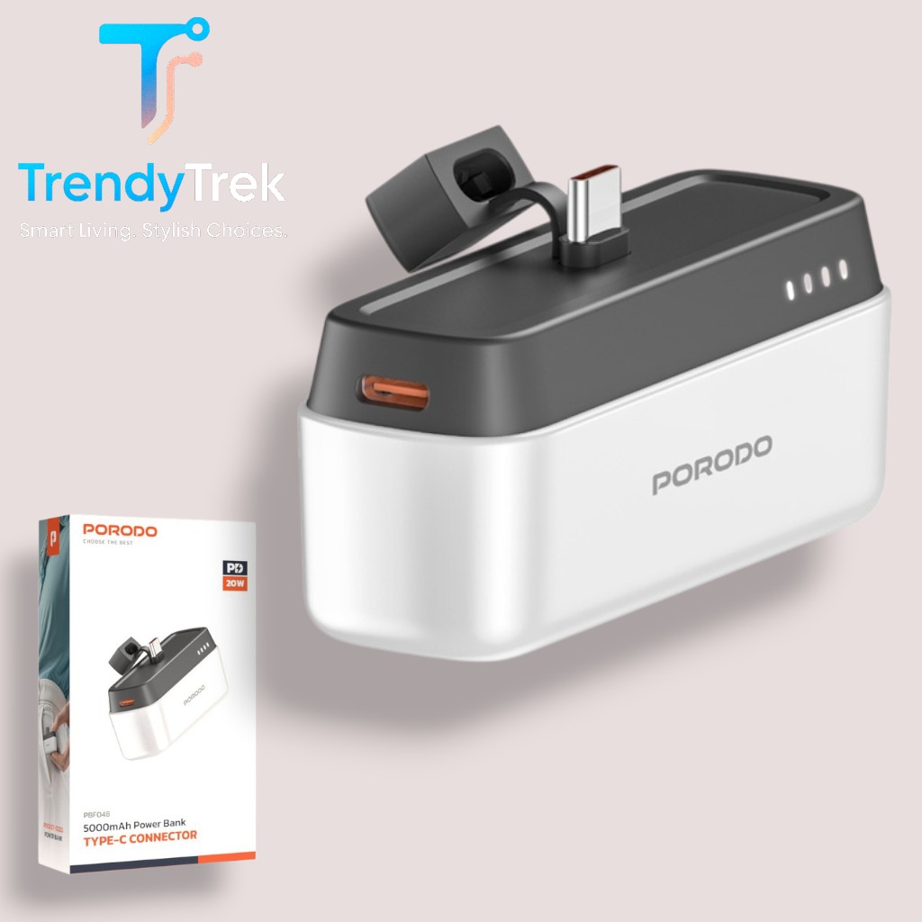 Slip power into any pocket. The Porodo 5000mAh Mini Power Bank (PB048) combines a built-in Type-C connector with a USB-C port so you can charge on the phone or via cable. It supports USB-C PD up to 20W for quick top-ups, shows charge level with LED indicators, and weighs just 101.5g—perfect for travel, commutes and nights out.