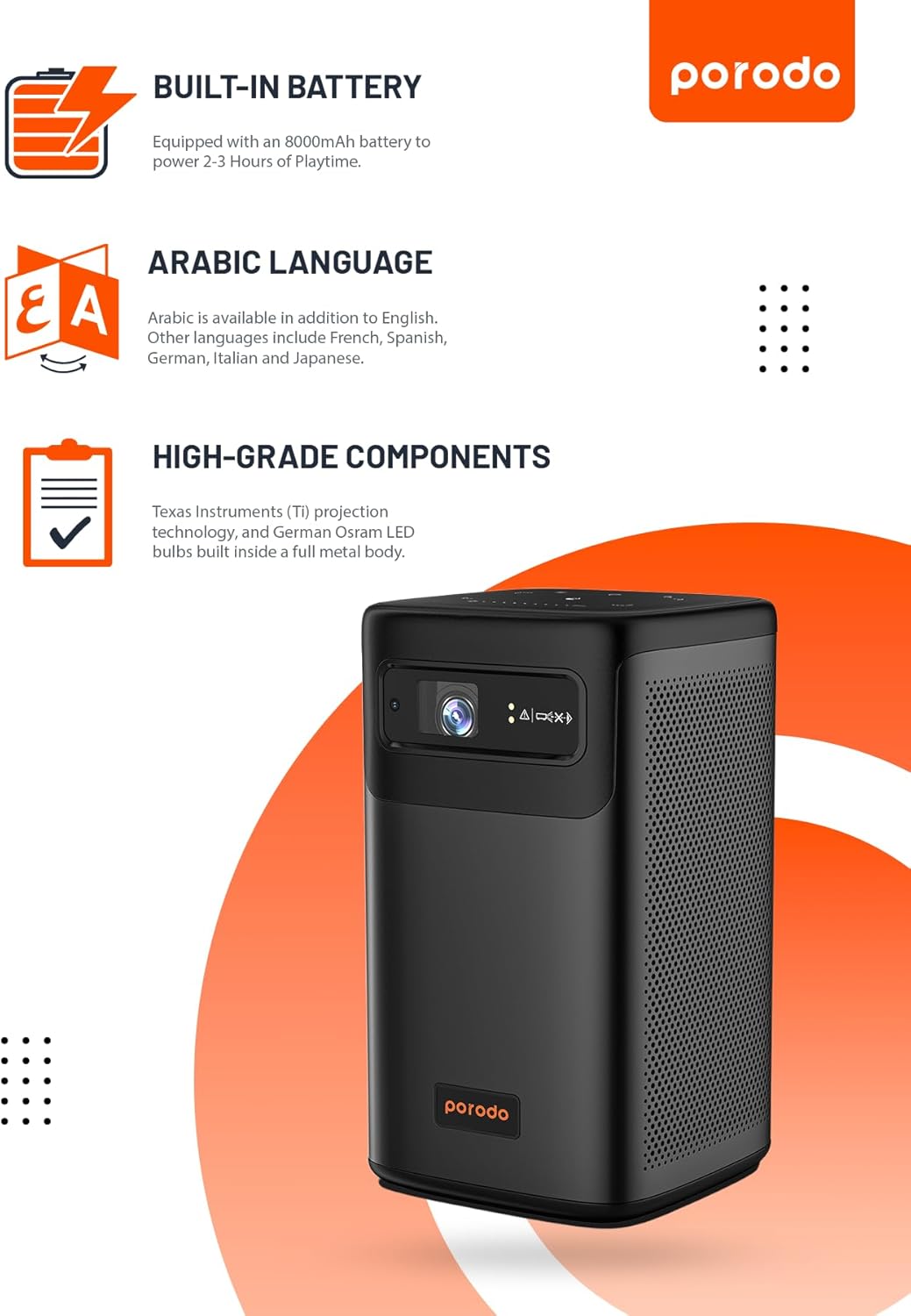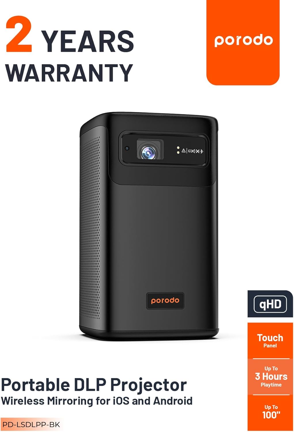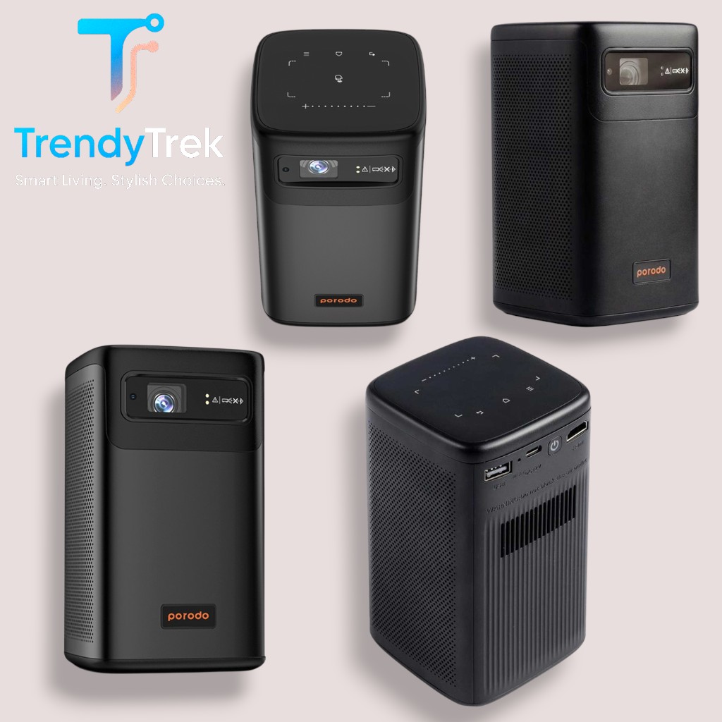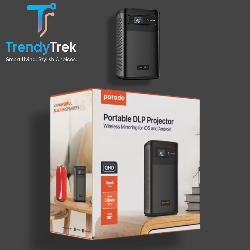 The Porodo Android 9.0 DLP Portable Projector is a compact, premium-quality smart projector designed for home, office, outdoor use, and entertainment on the go. Powered by Texas Instruments DLP projection technology and a German Osram LED light source, it delivers bright, clear visuals at QHD 960×540P resolution, projecting up to 100 inches with excellent sharpness and detail.