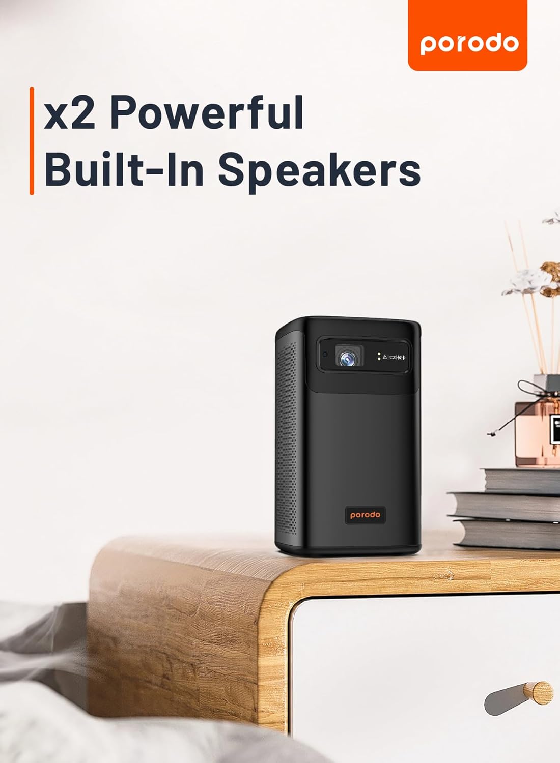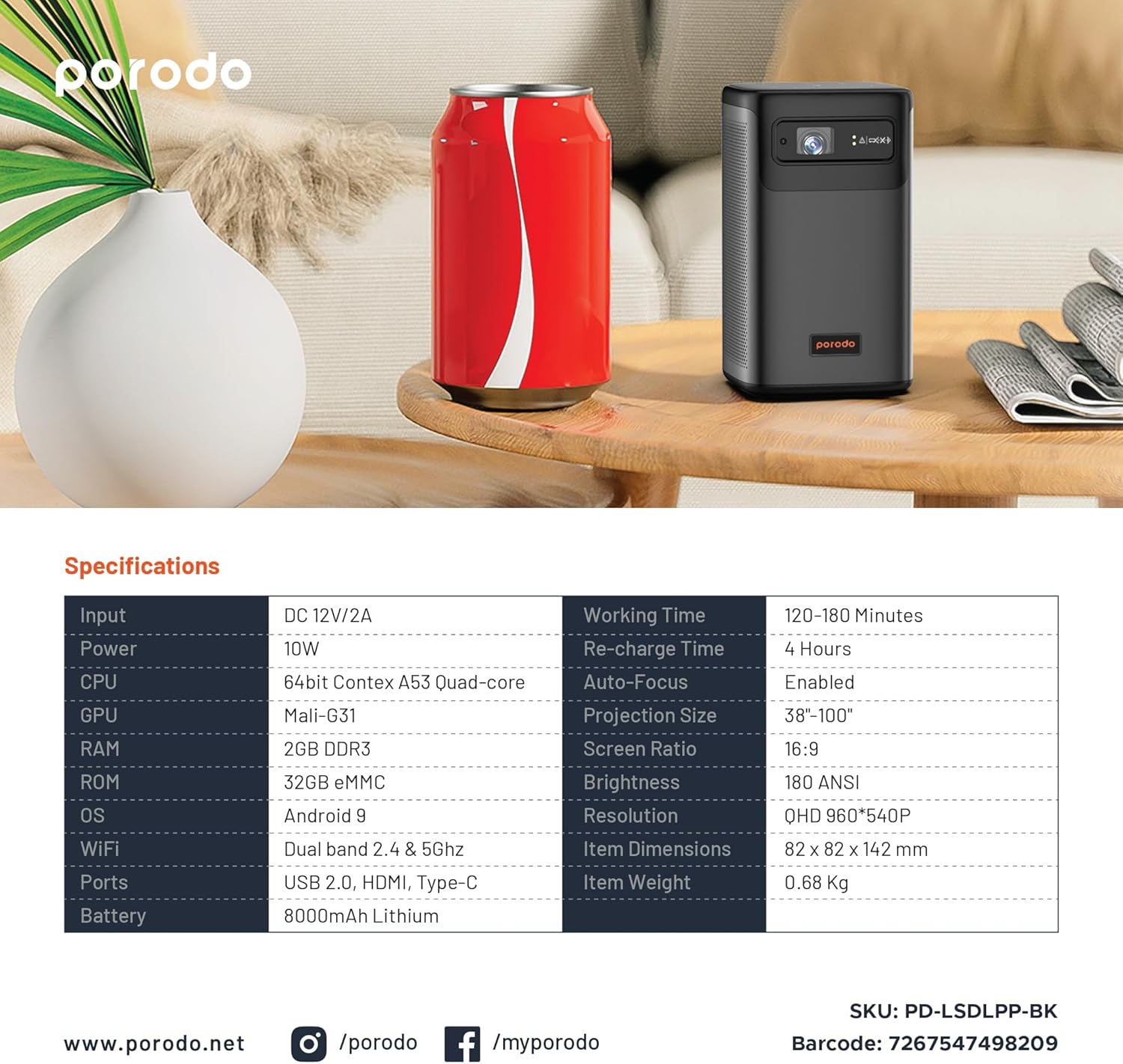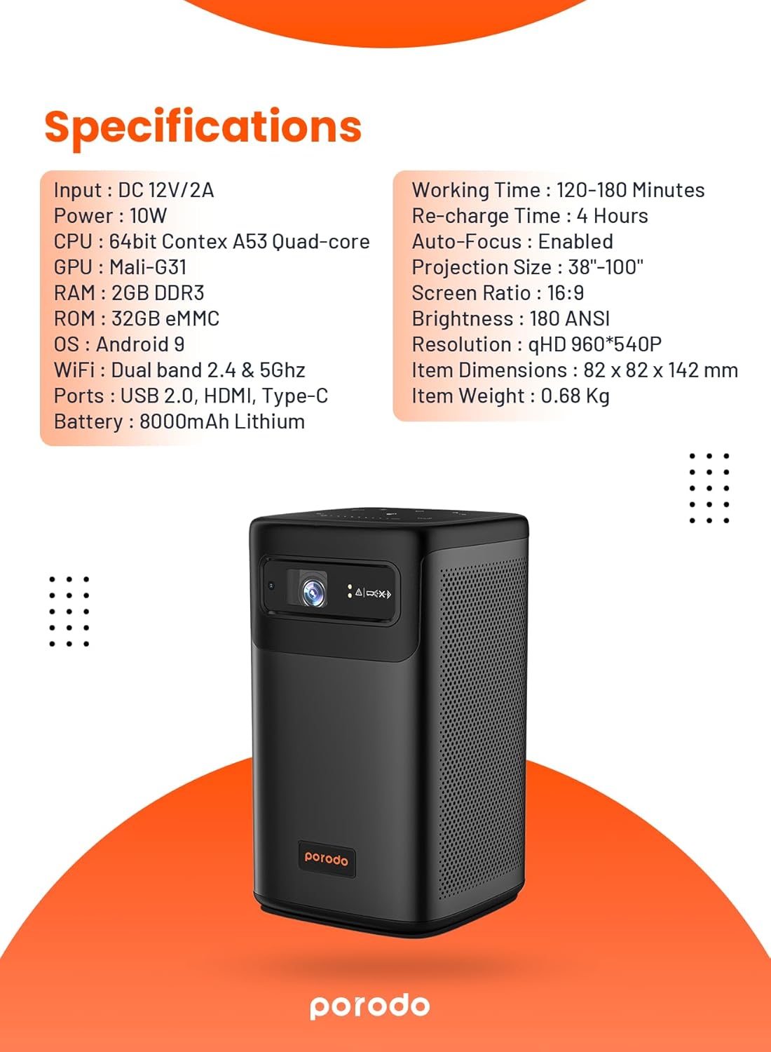The Porodo Android 9.0 DLP Portable Projector is a compact, premium-quality smart projector designed for home, office, outdoor use, and entertainment on the go. Powered by Texas Instruments DLP projection technology and a German Osram LED light source, it delivers bright, clear visuals at QHD 960×540P resolution, projecting up to 100 inches with excellent sharpness and detail.