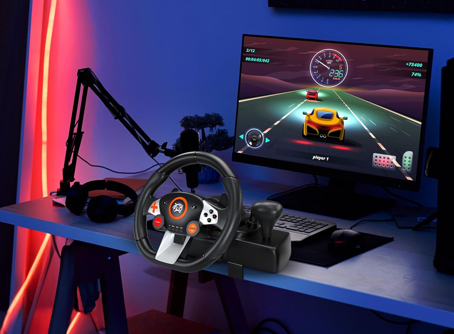 Setup is simple thanks to its clamp attachment system and plug & play compatibility. The wheel works seamlessly across multiple platforms including PS3, PS4, Xbox One, Xbox 360, Nintendo Switch, PC, and Android devices.