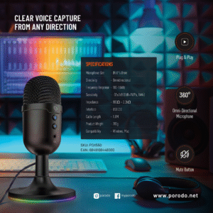 The Porodo Gaming Omni-Directional USB Microphone (PDX550) delivers crystal-clear voice capture for gamers, streamers, and content creators. With 360° omnidirectional pickup, it ensures consistent audio from every direction, making it perfect for online meetings, group discussions, or immersive multiplayer sessions.