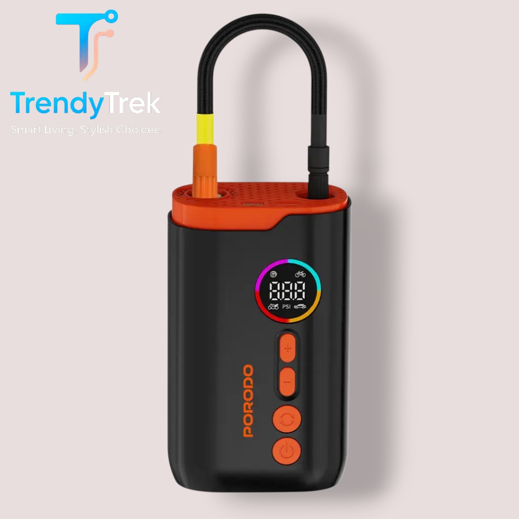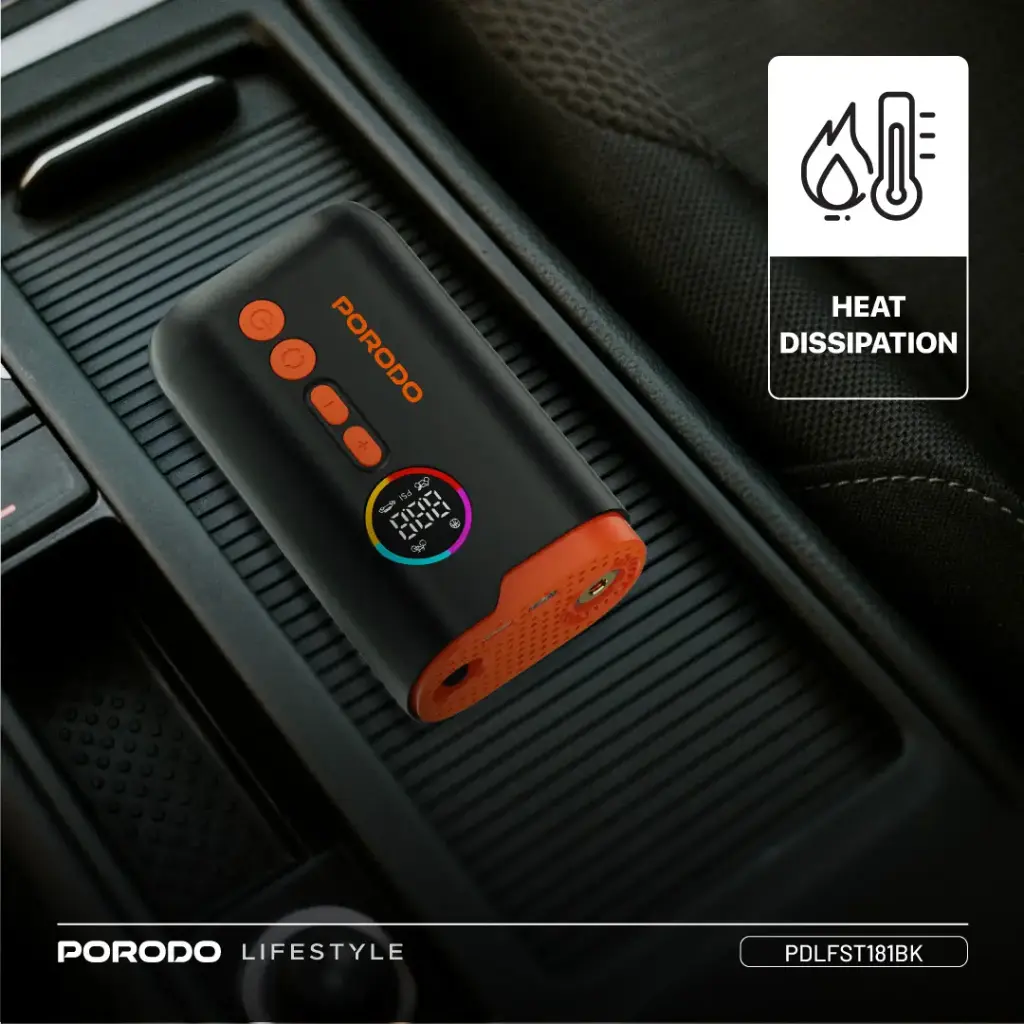 Designed for convenience, it features 4 dedicated inflation modes, automatic air-pressure detection, and an easy-to-read digital screen for precise monitoring. Safety is reinforced by Porodo’s advanced heat dissipation system, preventing overheating during continuous use.